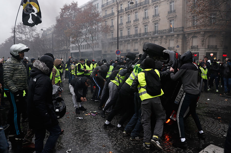 Demonstranti su postavili barikade u ulicama oko Trijumfalne kapije gdje su razbijali prozore na automobilima, zapalili više od deset vozila, uključujući i policijsko, kao i jedan restoran.