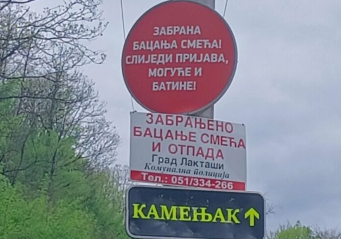 Na fotografiji snimljenoj kod Laktaša stoji tabla jasne poruke “Zabrana bacanja smeća! Slijedi prijava, moguće i batine!”