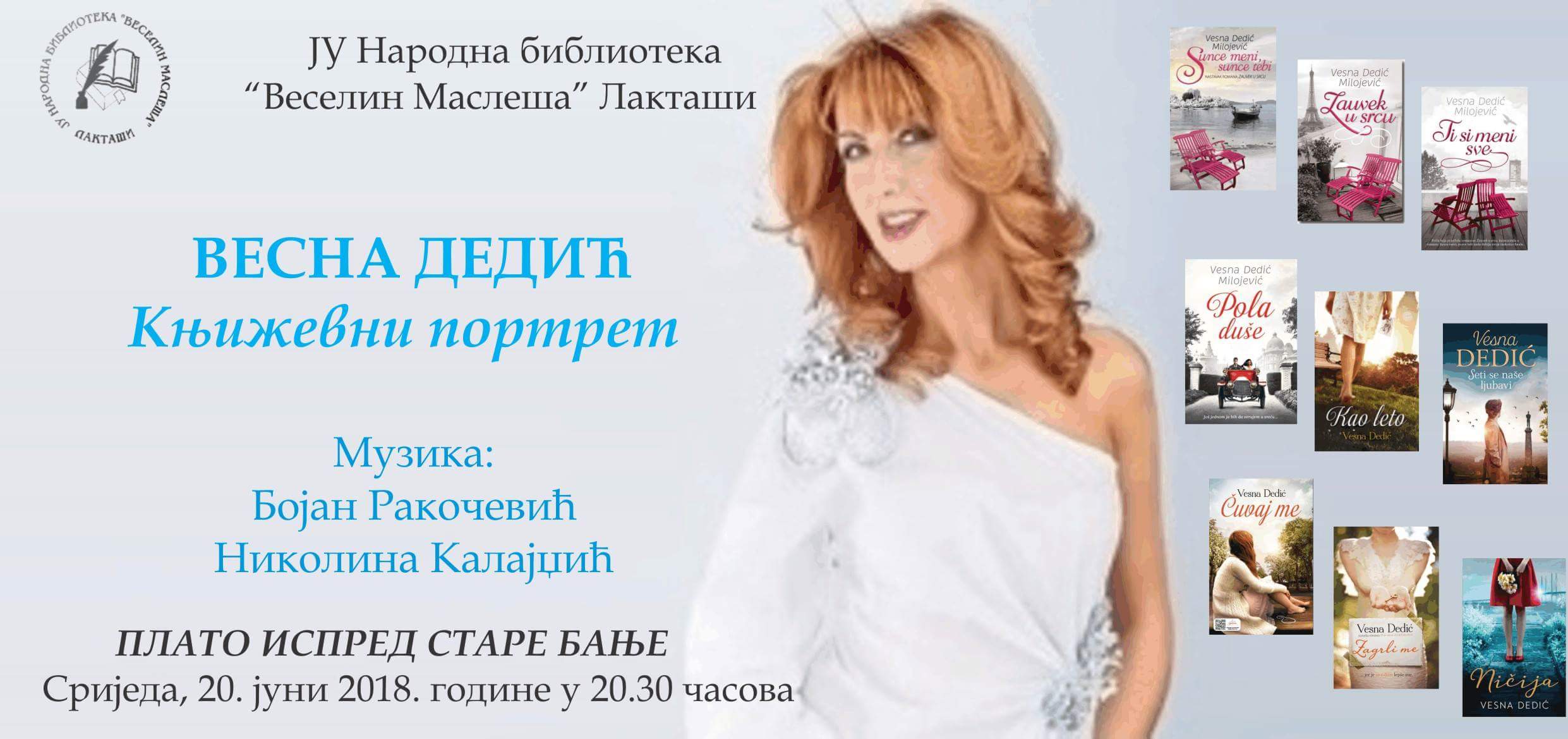 JU Narodna biblioteka „Veselin Masleša“ Laktaši organizuje druženje sa srpskom književnicom Vesnom Dedić, koje će biti održano 20. juna 2018. godine u 20.30 časova na Platou ispred Stare banje Laktaši.
