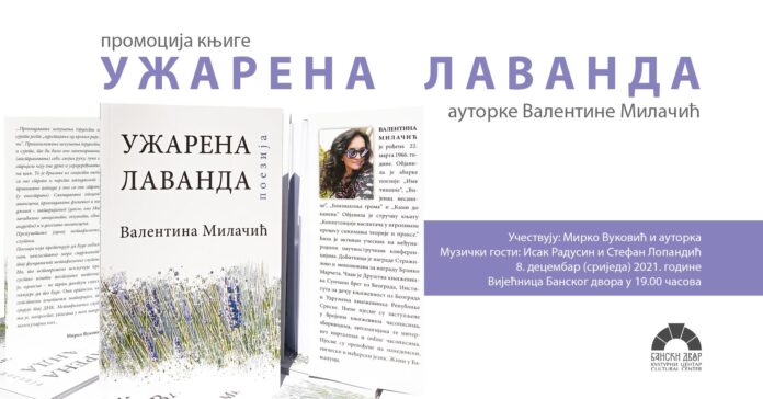 U Vijećnici Banskog dvora 8.decembra (srijeda) 2021. godine u 19.00 časova održaće se promocija knjige UŽARENA LAVANDA autorke VALENTINE MILAČIĆ.