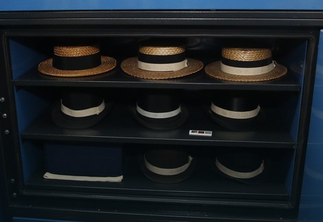 Iza vratanca jednog od plavih sanduka pokazuje nam tri reda slamnatih i crnih šešira koji bi pronašli svoje mesto u modi svake epohe. Tri “dugmenceta” unutar kasete ukazatelji su promena, važnih za njihovo čuvanje.