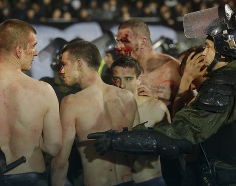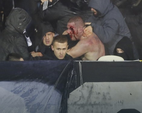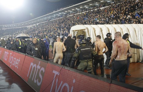 Podsetimo, u 16. minutu “večitog derbija” incident na južnoj tribini u kome su napadači najpre sa bakljama krenuli da se probijaju ka vođama “grobara”, a onda doživeli da ih višestruko brojniji rivali opkole, okončan je surovim prebijanjem izazivača incidenta, koji su, skoro svi, skinuti bar do pojasa, a neki od njih i skroz. Tako polugole i gole, a krvave od razbijenih glava, žandarmerija je izvela kroz kapiju na dnu južne tribine i, sprovevši ih preko atletske staze pred kraj prvog poluvremena, što je na kratko izazvalo prekid derbija, udaljila sa stadiona Partizana.